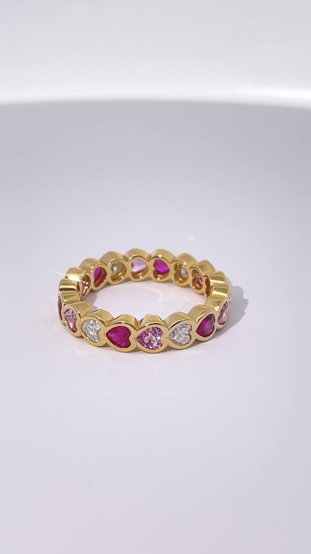 The Amour Band features a joyful mix of lab-grown pink sapphires, moissanites, and lab rubies, bezel set in a continuous flow. Soft pops of colour and gentle sparkle come together to create a ring that feels playful yet timeless.